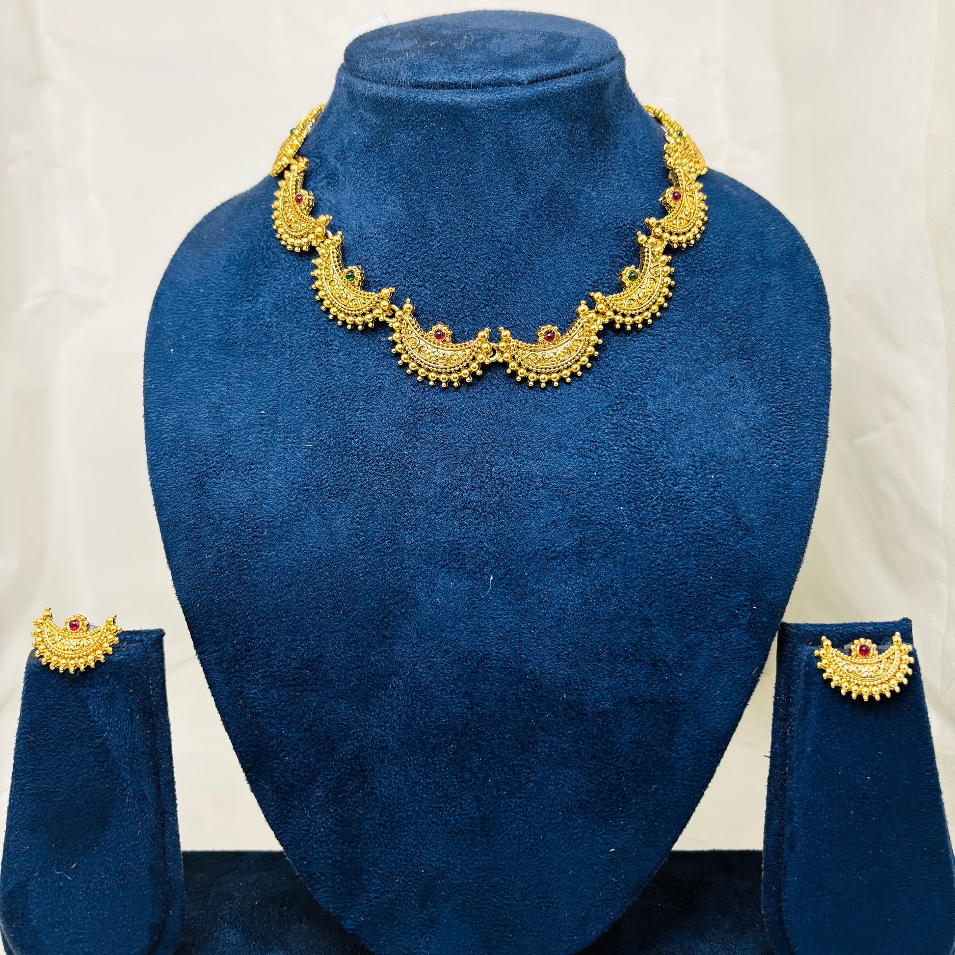 Introducing the Chandramukhi Necklace, designed to complement traditional attire. This exquisite set includes a stunning necklace and matching earrings, featuring a Chandra Mukhi design. Elevate your style with this elegant and versatile accessory.