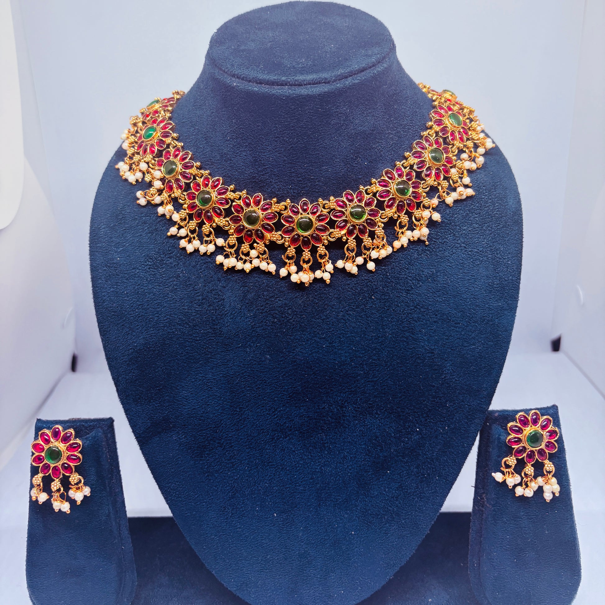 Celebrate tradition with the Sreshta floral necklace, a unique piece that beautifully blends classic charm with elegant craftsmanship. Its intricate floral design adds a touch of grace to any outfit, making it perfect for special occasions or everyday wear. Embrace timeless beauty and stand out with this exquisite accessory.